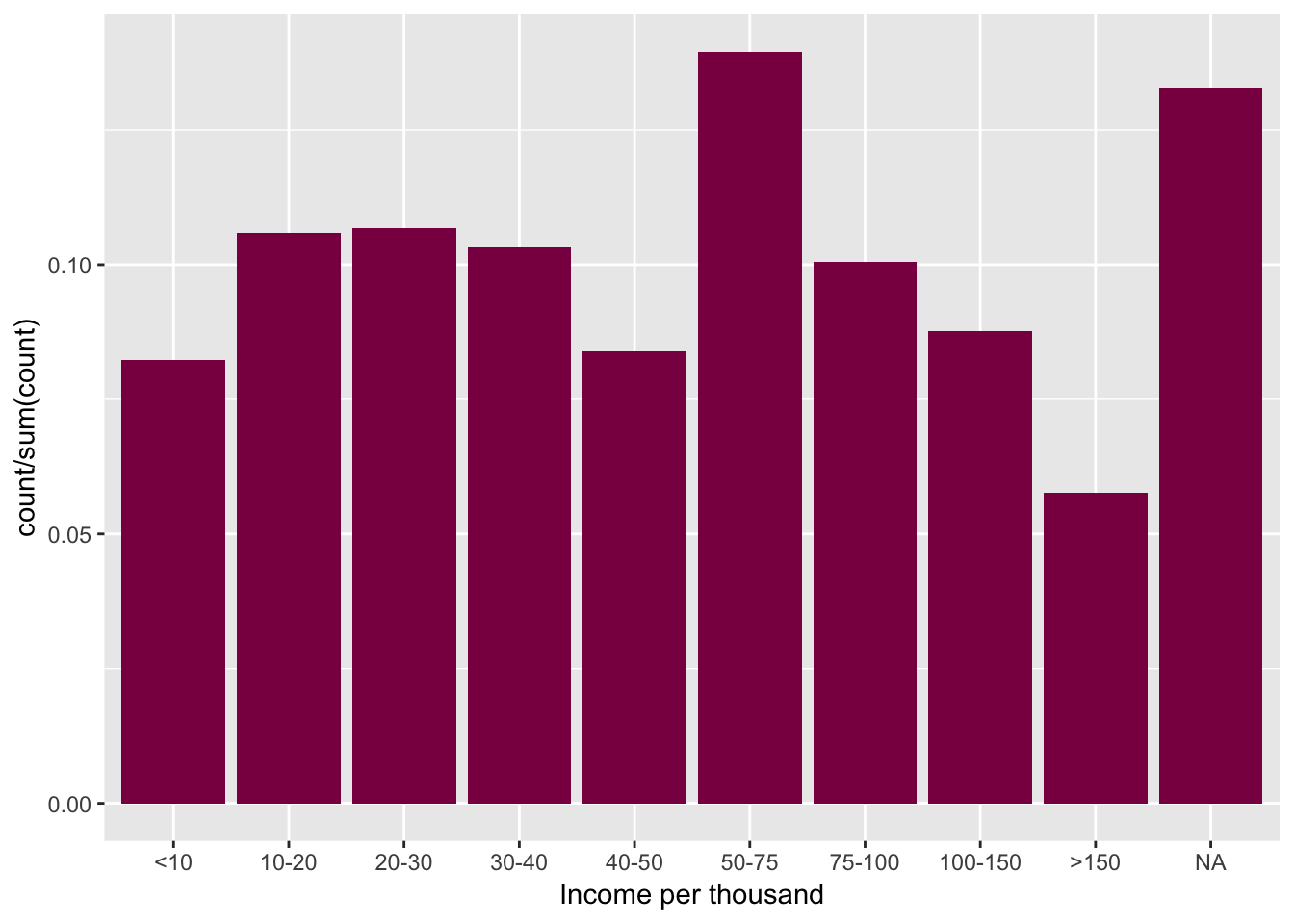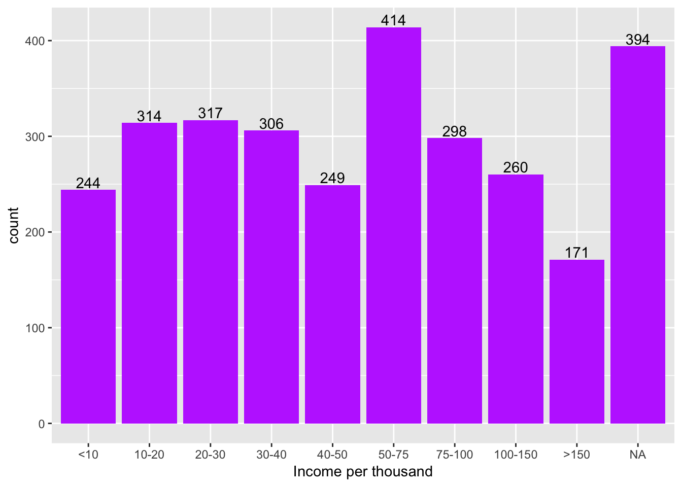 This bar chart represents the percentages of people in each category of income in thousands of dollars per year. The last bar “NA” represents the percentage of people that declined to answer the question. We can see that more than 13% of people participating (2,967) in the survey decided not to answer.