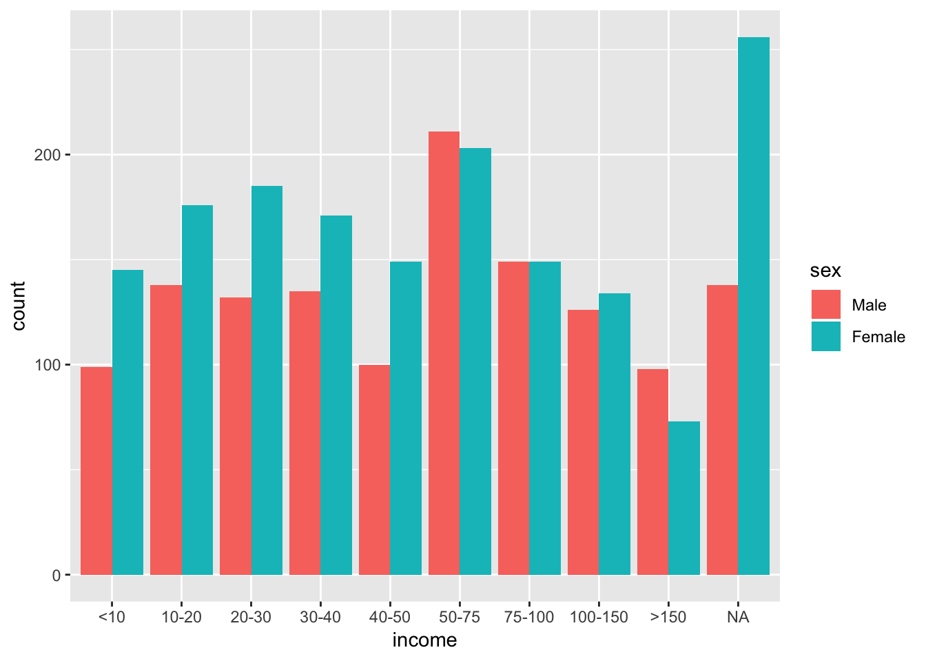 levels(df3$income)<-c("<10","10-20","20-30","30-40","40-50","50-75","75-100","100-150",">150", "NA")